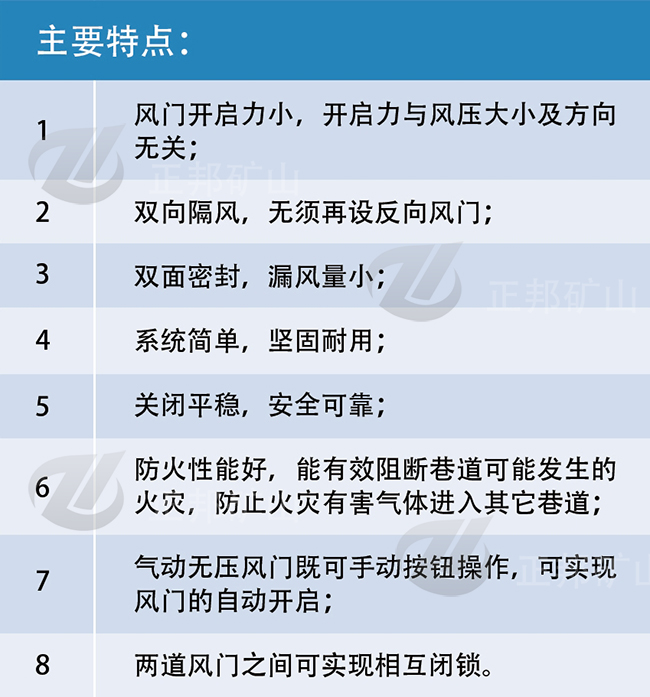 正邦無壓風門用于井下進回風巷和主要進回風巷之間的每個聯絡巷中,開啟力小,無需再設反向風門,人和車過后,能自動關閉,是目前我國煤礦井下較為理想的一種風門。