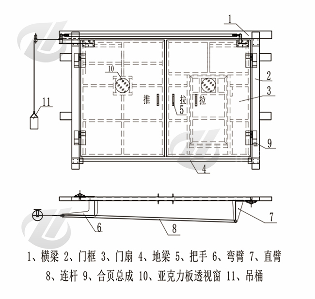 本無壓風門由門框、門扇、平衡機構及配重等部分組成1、門框為矩形管組焊而成,分體組裝